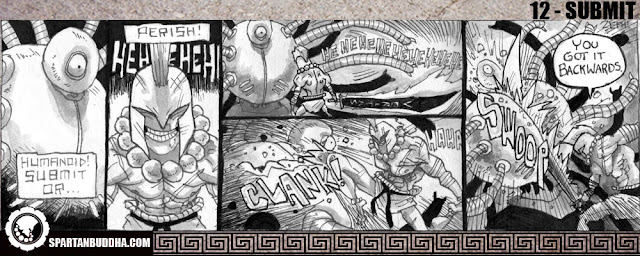 Did you really think that Spartan Buddha was gonna let some machine boss him around? Just because it’s smarter and faster and probably has more friends than he does, doesn’t mean he has to listen to it. That’s ZOMBIE logic. We’re not robot slaves (yet). We don’t have to update our statuses every time we scratch ourselves or judo throw our grandmothers out of the way to answer our cellphones. We still run shit. Technology works for most of us. These robots need obedience training and if they don’t want to listen, then maybe they need to be cut down… Where’d that sword come from?